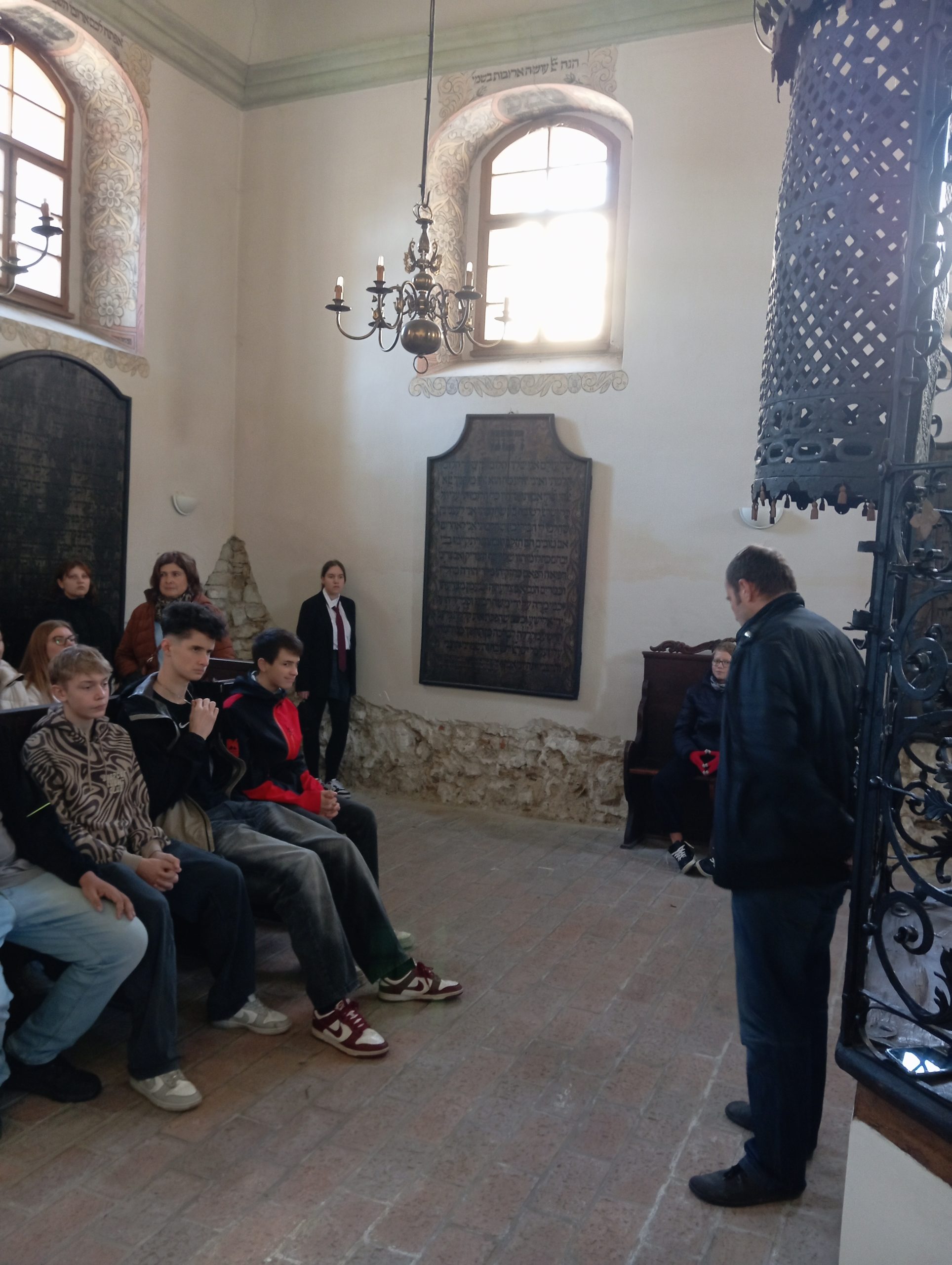 Po příchodu do synagogy nás přivítal pan průvodce Vratislav Brázdil, který poutavě vyprávěl o vzniku stavby, architektuře i o osudech místní židovské obce. Dozvěděli jsme se, že holešovská synagoga byla postavena již v 16. století a za dobu své existence několikrát přestavována. Zajímavé bylo i vyprávění o slavném rabínu Šabtajovi ben Meirovi ha-Kohenu, známém jako Šach, jehož hrob se nachází nedaleko synagogy a je cílem návštěv mnoha lidí z celého světa.